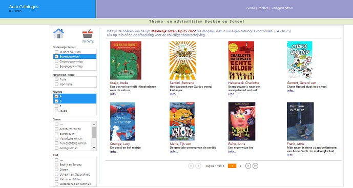 Wanneer u uw eigen catalogus vergelijkt met één van de advieslijsten, toont Aura u de titels die in uw schoolbibliotheek of mediatheek ontbreken. U kunt deze vervolgens direct bestellen vanuit Aura. Handiger kan niet. Op deze manier kunt u makkelijk en snel uw collectie uitbreiden met interessante titels die uw leerlingen graag zullen lezen.