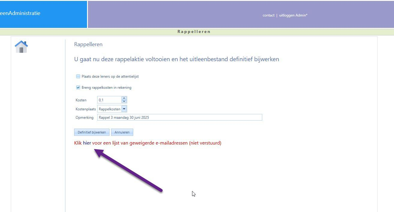 In de Uitleeninfo van de lener kunt u ook de rappelgegevens raadplegen (zie ‘Uitleeninfo’).