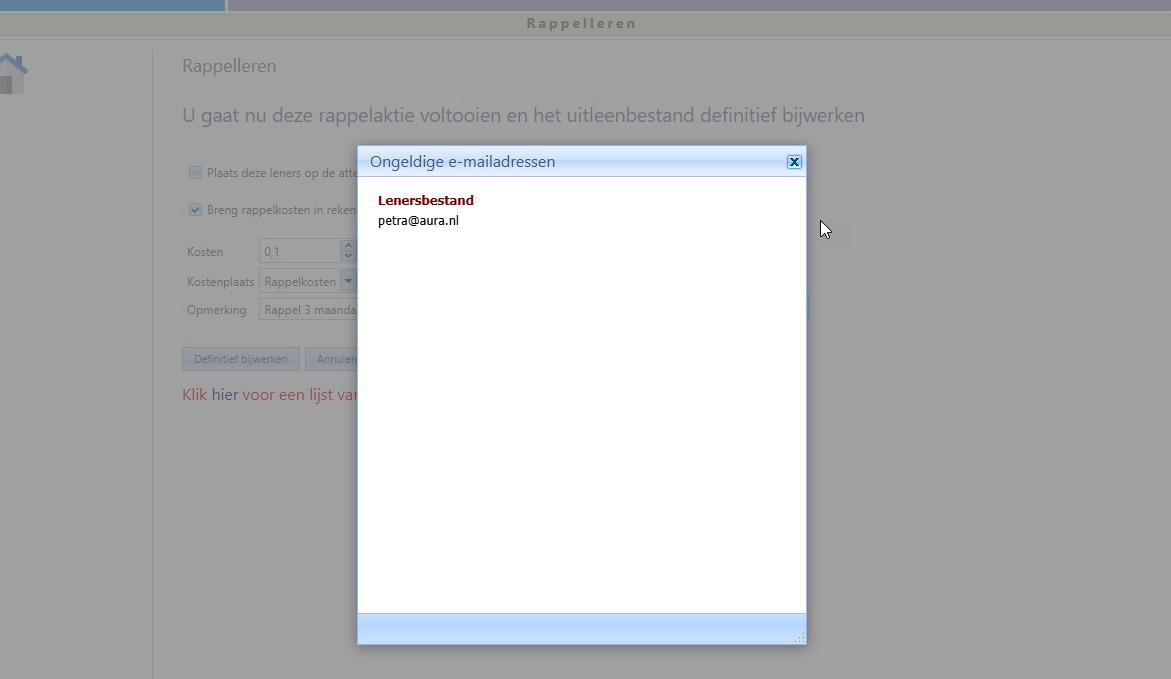 * Definitief bijwerken: Dat betekent dat in Aura wordt vastgelegd dat de titels zijn gerappelleerd. In het uitleenbestand wordt nu de datum van Rappelleren vastgelegd en wordt de teller in het veld Rappel bijgewerkt**. Als u de rappelbrieven (gedeeltelijk) per e-mail hebt verstuurd, is het natuurlijk niet zinvol om de rappelactie te annuleren. De e-mails zijn immers al verstuurd en kunnen niet meer worden geannuleerd. Annuleert u de rappelactie toch dan wordt het rappelbestand niet bijgewerkt en 'weet' Aura niet dat u heeft gerappelleerd: bij de volgende keer rappelleren worden dezelfde leners weer opnieuw aangeschreven, met dezelfde rappelbrief. Op deze pagina kunt u ook zien of alle e-mails zijn bezorgd. Zijn er e-mails niet bezorgd (vanwege incorrecte e-mailadressen) dan krijgt u de volgende melding: